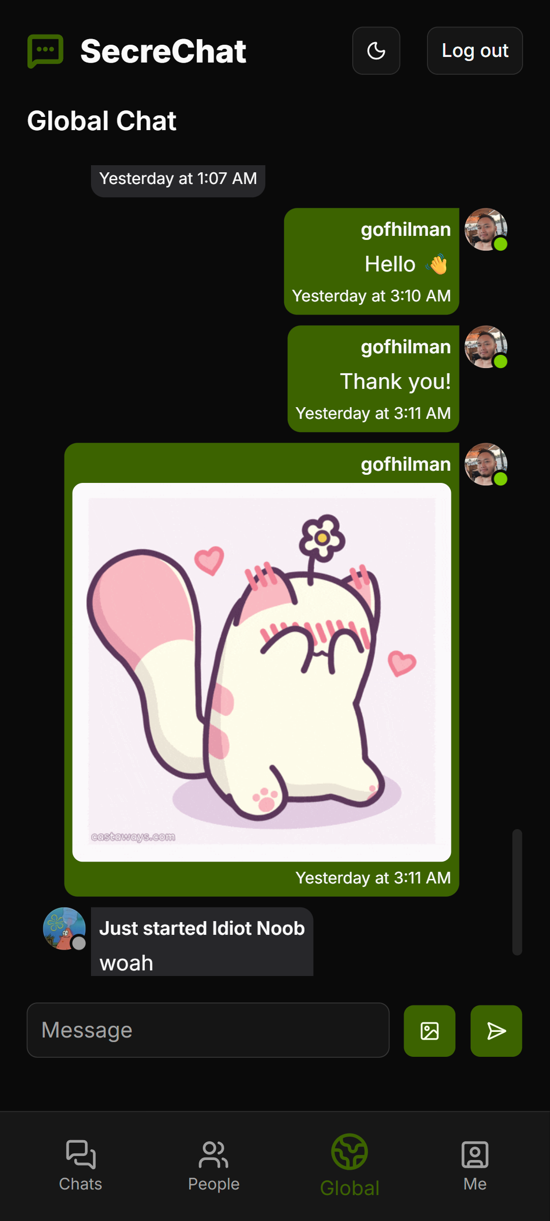Hey guys, I've made a proper web-based chat app with free resources where the user actually can interact with another user in private, create and chat in a group, or join the global chat of this app. It's called SecreChat. I made this app in a week, so only essential features are available.